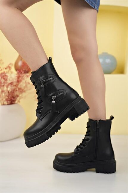 Bottes noires pour femmes en PU cuir, avec semelle épaisse, fermeture éclair et lacets, à hauteur moyenne et talon de 5 cm, idéales pour un usage quotidien.